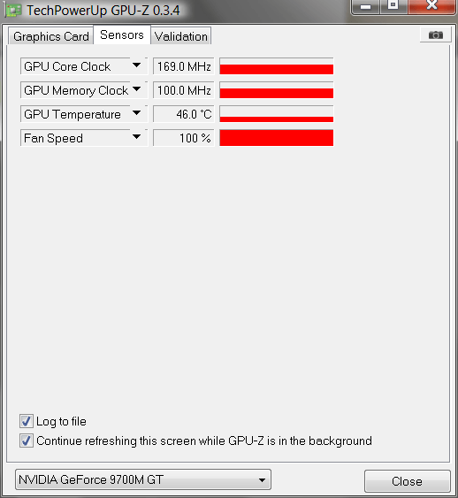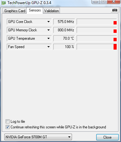 techPowerUp! - The latest in hardware and gaming kann man alle Infos zur GraKa abrufen, und natürlich auch die Temperatur angezeigt bekommen. Meine nVidia 9700m läuft jetzt im Normalbetrieb auf ca. 50 Grad, und bei Spielen bis maximal 80 Grad, wobei mittels RivaTuner der Shader auf 1200Mhz hochgechraubt wurde, und der Speichertakt nur leicht auf 320Mhz. Spielen tue ich hauptsächlich C&C3, AoEIII, Neverwinter Nights 2, Oblivion, Stalker, CFS3 bzw die Erweiterung Over Flanders Fields, und das ganz neue Rise of Flight.